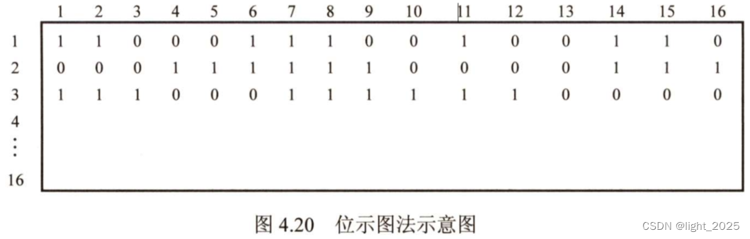位示图是利用二进制的一位来表示磁盘中一个盘块的使用情况,磁盘上所有的盘块都有一个二进制位与之对应。当其值为 “0” 时,表示对应的盘块空闲;为 “1” 时,表示已分配。这样,一个m*n 位组成的位示图就可用来表示 m*n 个盘块的使用情况: