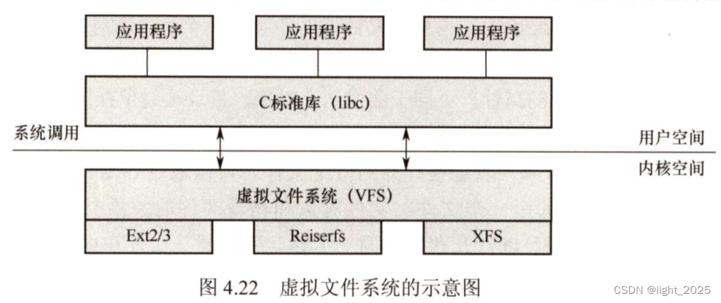 虚拟文件系统(VFS)为用户程序提供了文件系统操作的统一接口,屏蔽了不同文件系统的差异和操作细节。用户程序可以通过 VFS 提供的统一调用函数(如 open() 等)来操作不同文件系统(如 ext3 等)的文件,而无须考虑具体的文件系统和实际的存储介质。