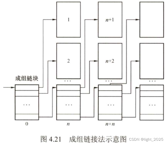 用来存放一组空闲盘块号(空闲盘块的块号)的盘块称为成组链块。成组链接法的大致思想是:把顺序的 n 个空闲盘块号保存在第一个成组链块中,其最后一个空闲盘块(作为成组链块)则用于保存另一组空闲盘块号,如此继续,直至所有空闲盘块均予以链接。系统只需保存指向第一个成组链块的指针。