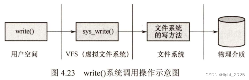 虚拟文件系统采用了面向对象的思想,它抽象出一个通用的文件系统模型,定义了通用文件系统都支持的接口。新的文件系统只要支持并实现这些接口,即可安装和使用。以 Linux 中调用 write() 操作为例,它在 VFS 中通过 sys_write() 函数处理,sys_write() 找到具体文件系统,将控制权交给该文件系统,最后由具体文件系统与物理介质交互并读出数据;