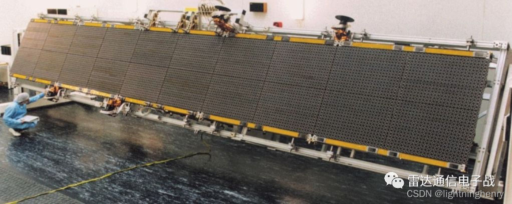 首先,最直观地,从外观上看最大不同可能就是天线的形状了,SAR的天线是长条形的,下图就是星载SAR的相控阵天线。星载SAR由于要搭载火箭发射,天线太大,所以星载SAR的天线和太阳能帆板一样还得有展开机构。