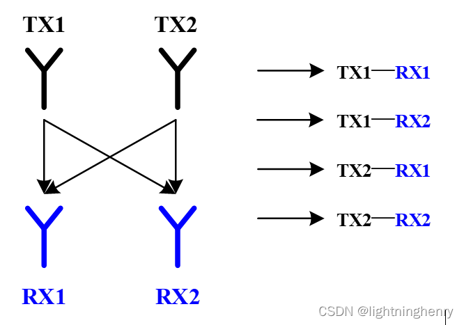 图中2个TX和2个RX组成了四条传输支路,分别为TX1RX1、TX1RX2、TX2RX1和TX2RX。RX1和RX2分别接收到TX1和TX2合成信号,当TX1和TX2发射波形完全正交时,RX1和RX2通过接收分离处理后,得到四路相互独立的信号(不存在互相关项),相当于1发4收的效果。