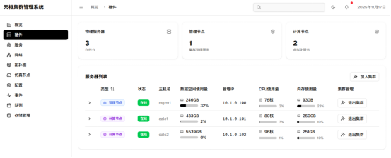 1、硬件环境:主控配置40核80线程、内存128GB;节点服务器2台配置分别为40核80线程、内存256GB,48核96线程、内存256GB;支持多设备拓扑部署。