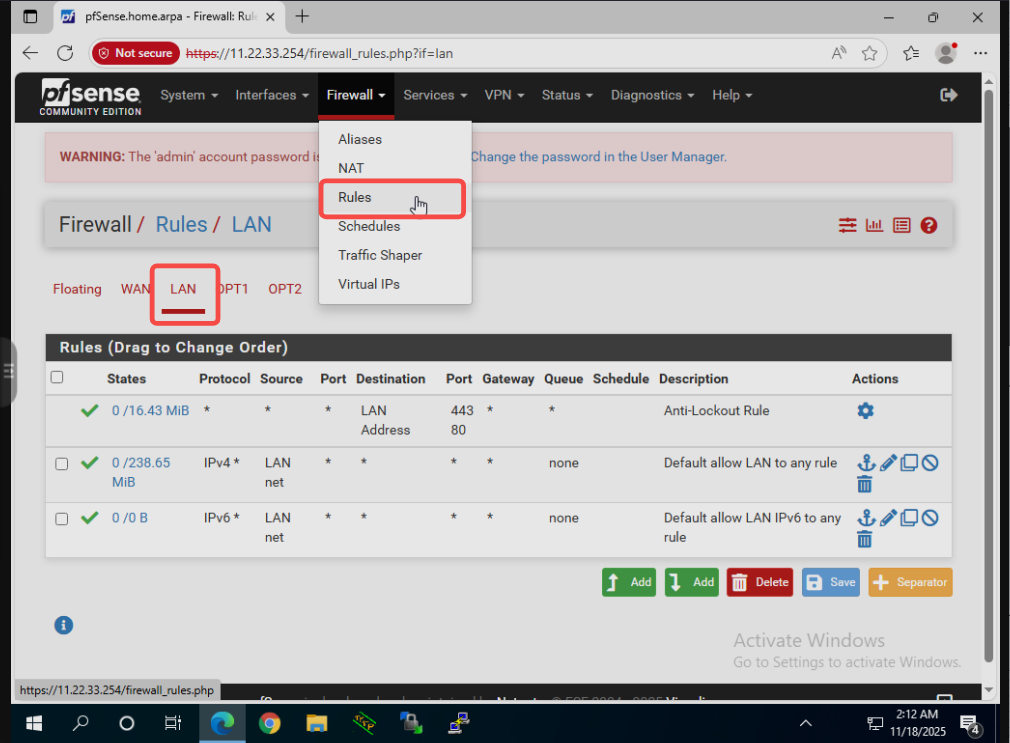 进入后可以看到lan口有web端的放行和正常流量的放行