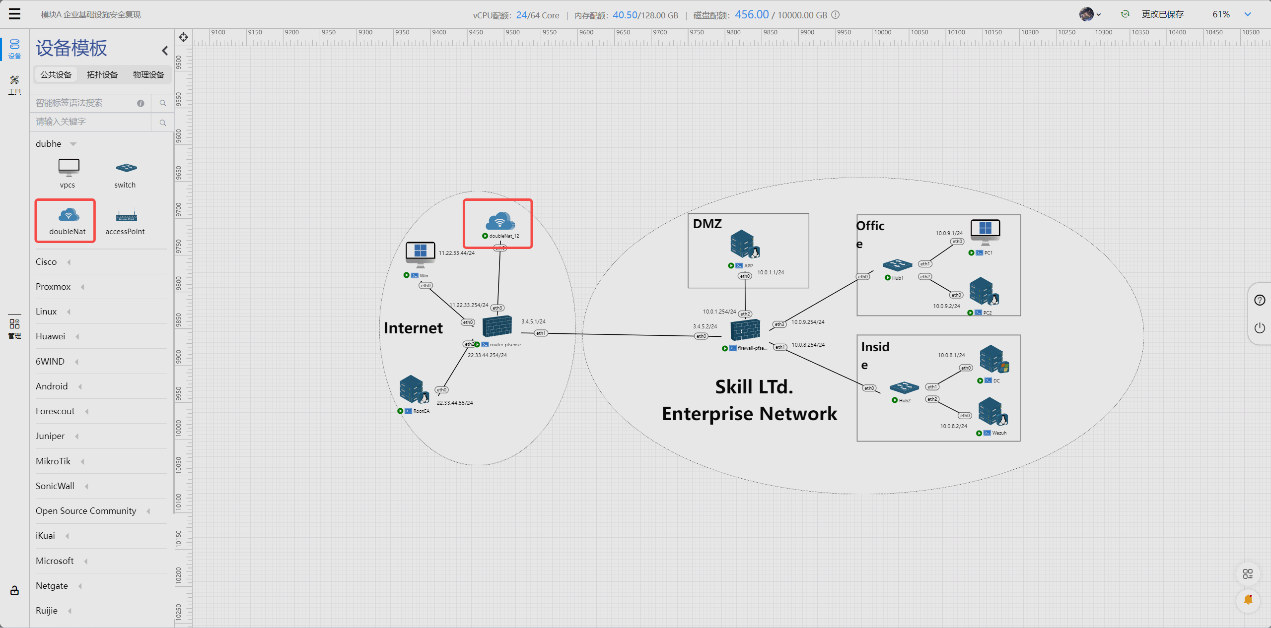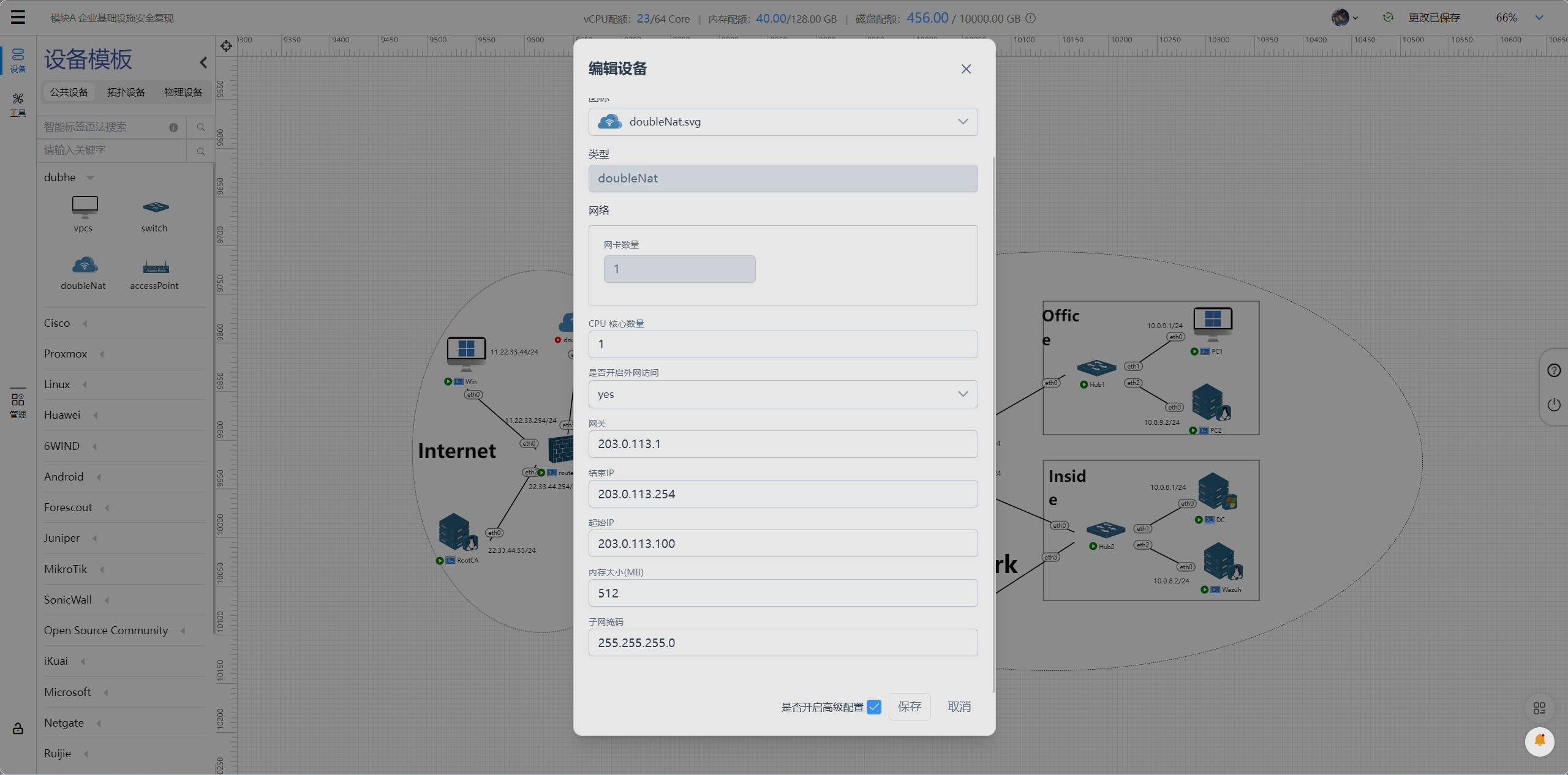 接下来介绍一个网络拓扑方案中的所有设备的出网方案使用天枢平台的DoubleNat设备进行出网配置,因firewall-pfsense的WAN已被占用,为配置方便我们将出网口连接到了router-pfsense从而达到业务网络的出网需求。