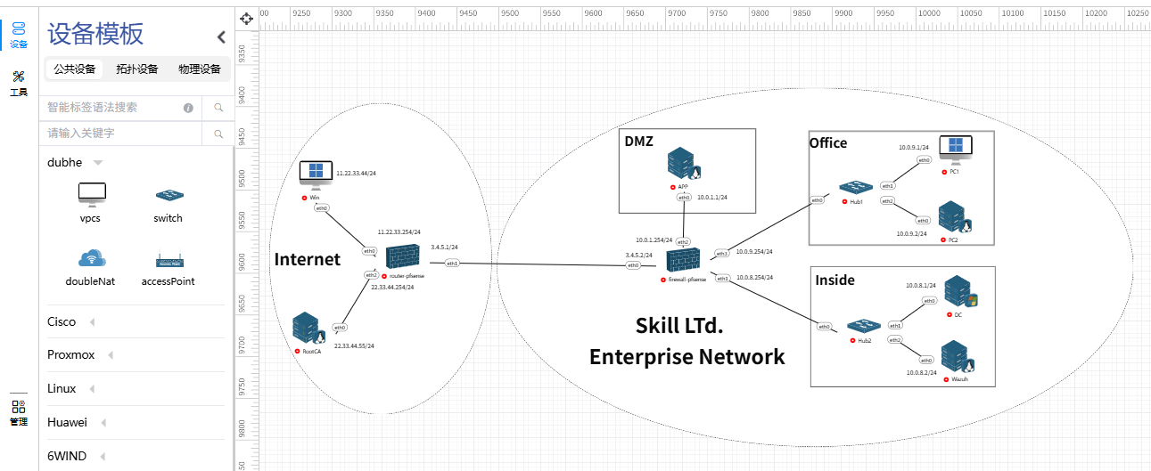 通过之前配置好ip之后大家可能会发现只有部分设备可以ping通,这是因为pfsense在初始化的时候默认只对lan口做了规则放行,后续创建的接口都没有放行,需要进入web端进行配置,注意默认只有lan口才有进入web的放行规则;接下来我们将针对router-pfsense和firewall-pfsense进行下一步的配置。通过网页打开昨天我们配置的拓扑图,复现与联系平台采用了:天枢一体化虚拟仿真靶场平台。