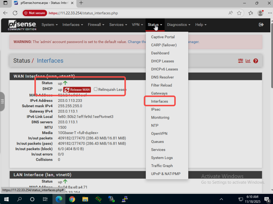 启动dubhenat后可以等待pfsense自己刷新wan口ip也可以进入web页面手动更新
