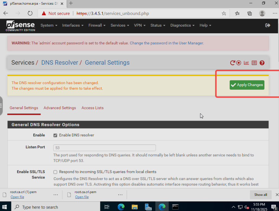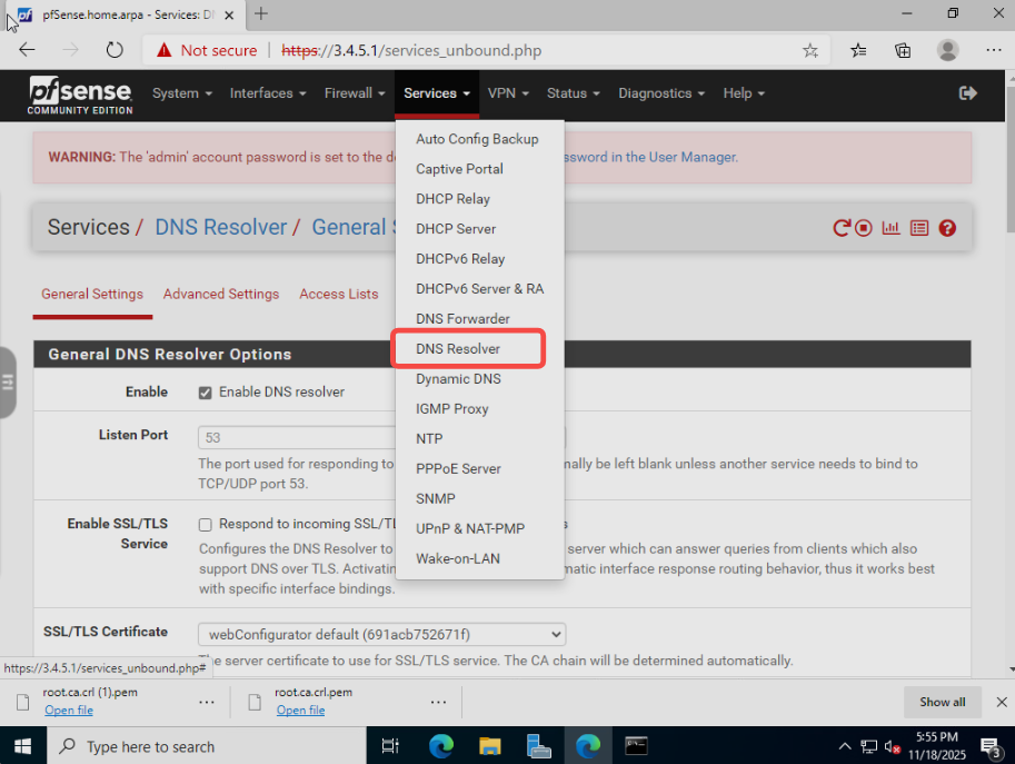 点击顶部菜单 Services > DNS Resolver > General,确认 “Enable DNS resolver” 已勾选(启用 DNS 解析功能),“Listen Port” 保持默认53。