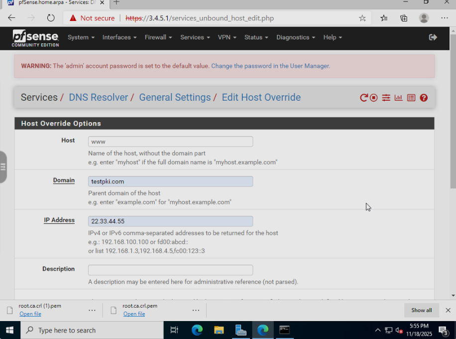 实现目标:将www.testpki.com域名解析到根 CA 服务器的 IP(22.33.44.55),确保客户端能通过域名访问 CRL。
