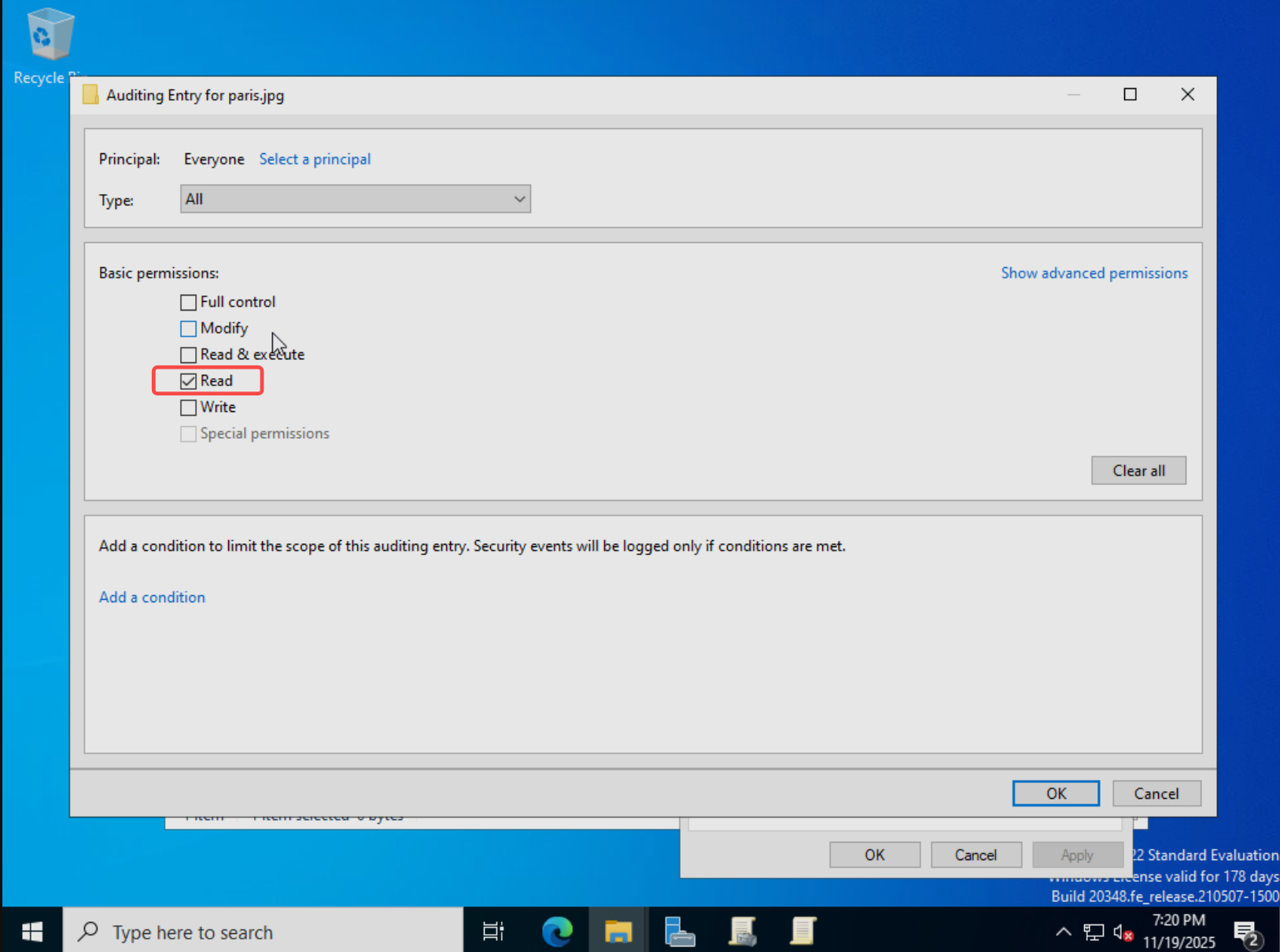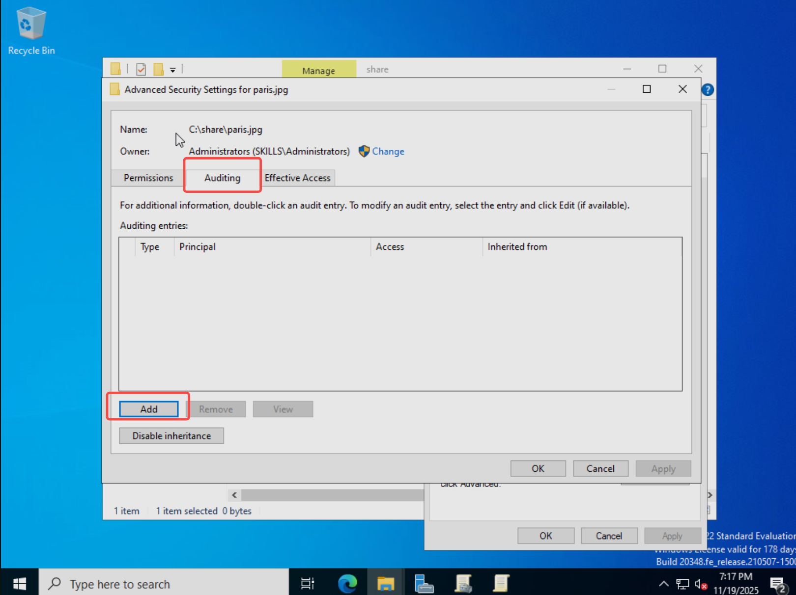 ③ 对C:\share文件夹中的paris.jpg文件设置审计,使域内任何用户访问该文件时都会被记录事件日志。