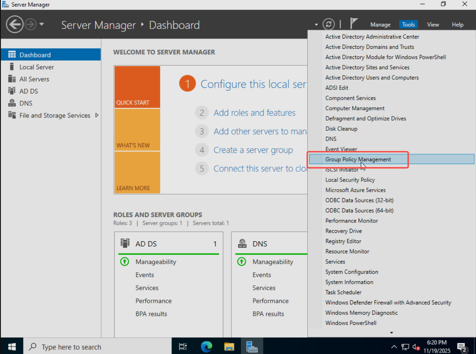 【Server Manager】→ 【Tools】→ 打开【Group Policy Management】