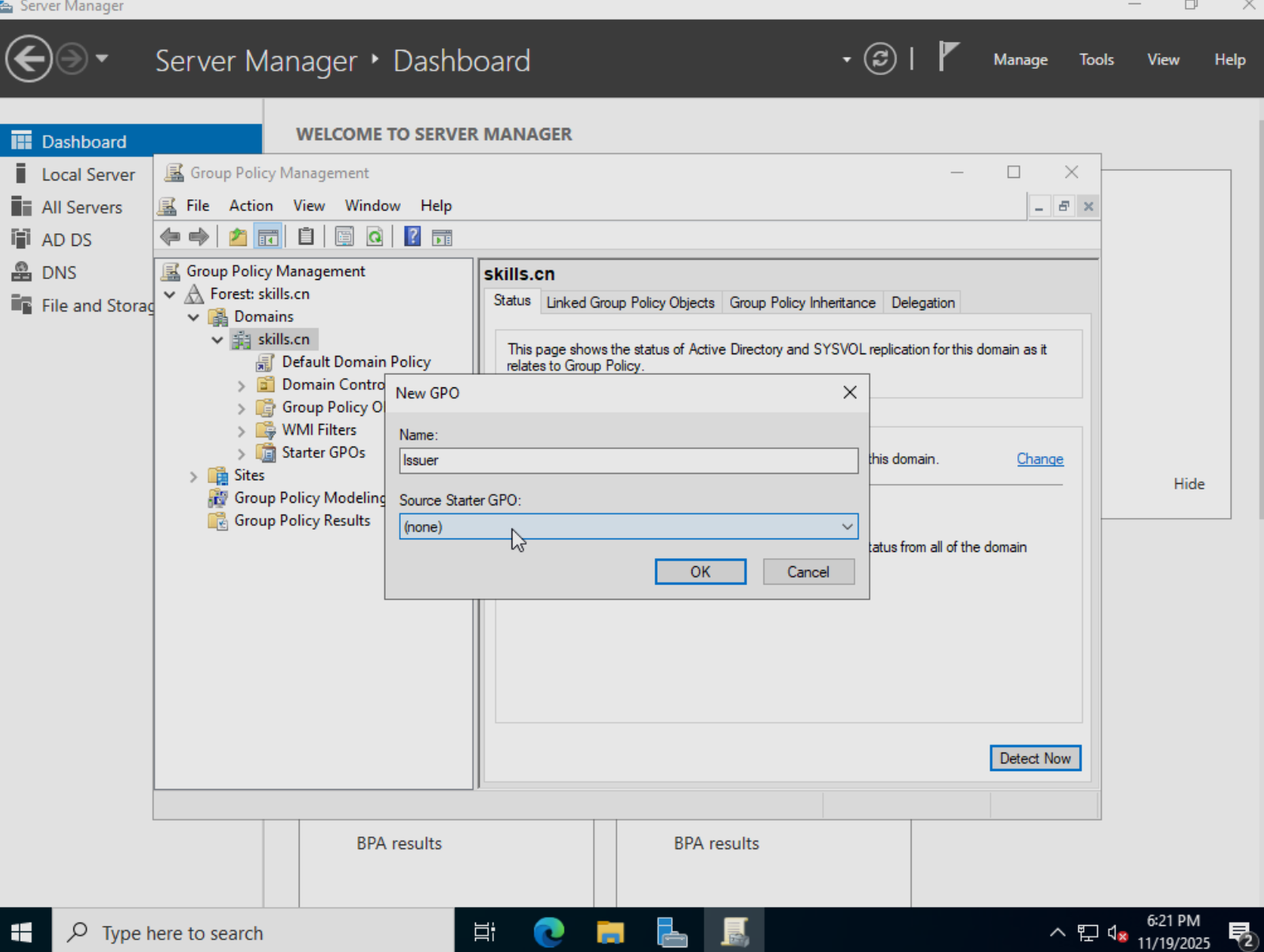GPO 名称输入【Issuer】→ 点击【确定】(创建 GPO 并自动链接到skills.cn域)
