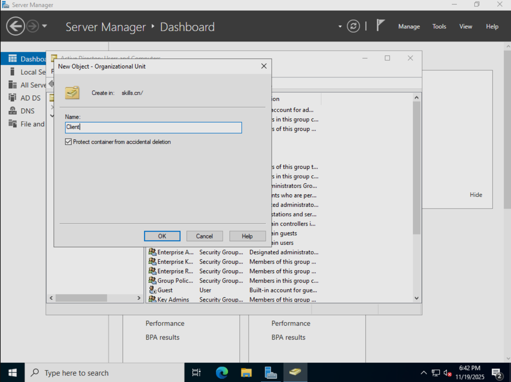 - ADUC→ 右键skills.cn→ 【News】→ 【Organizationl Unit】→ 名称输入【Client】→ 取消勾选【防止意外删除】→ 确定