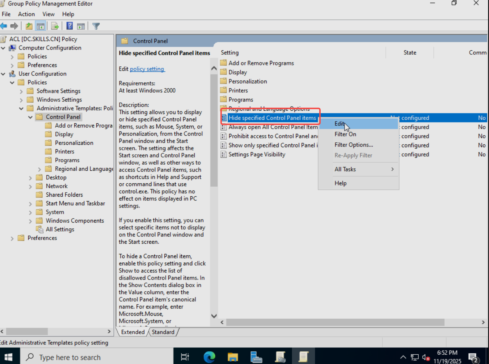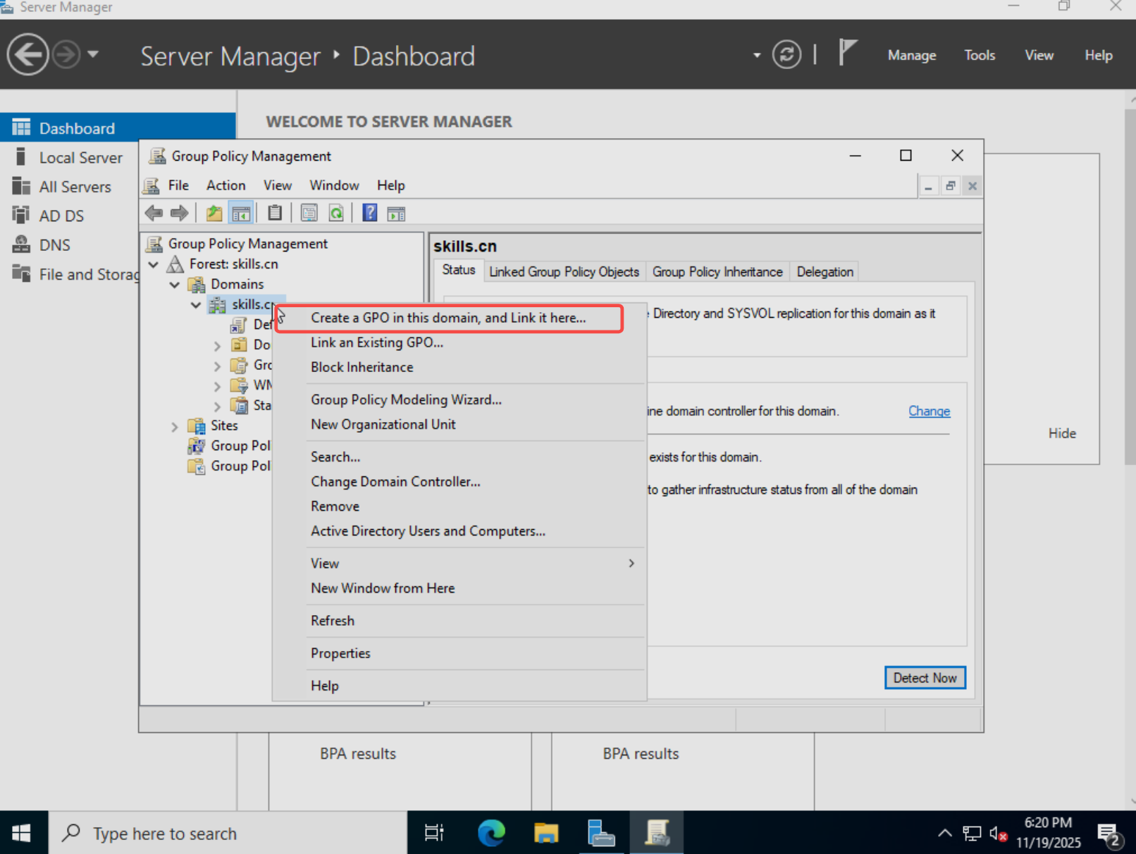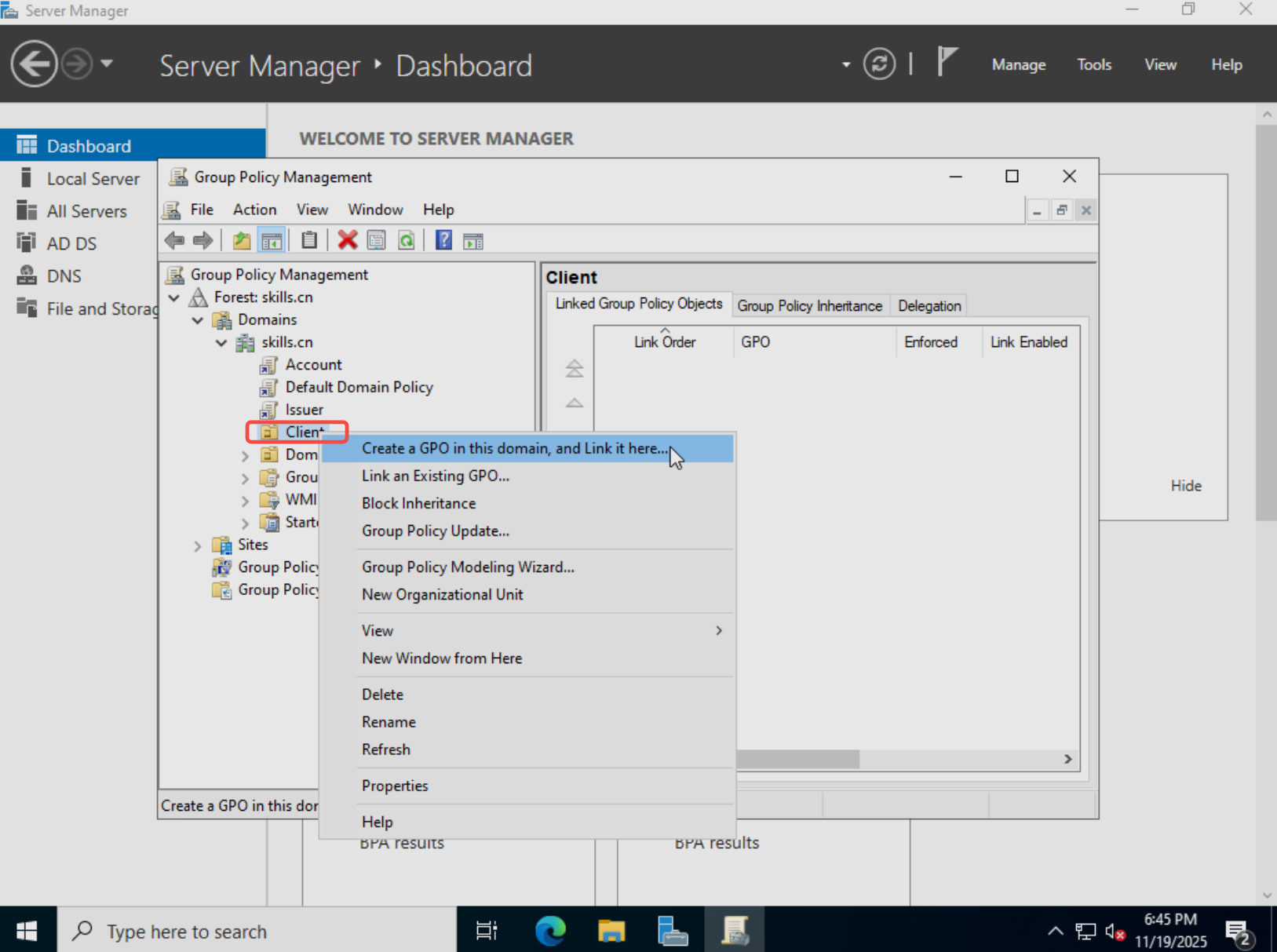 展开【林: skills.cn】→ 【域】→ 右键skills.cn→ 【Create a GPO in this domain, and Link it here...】