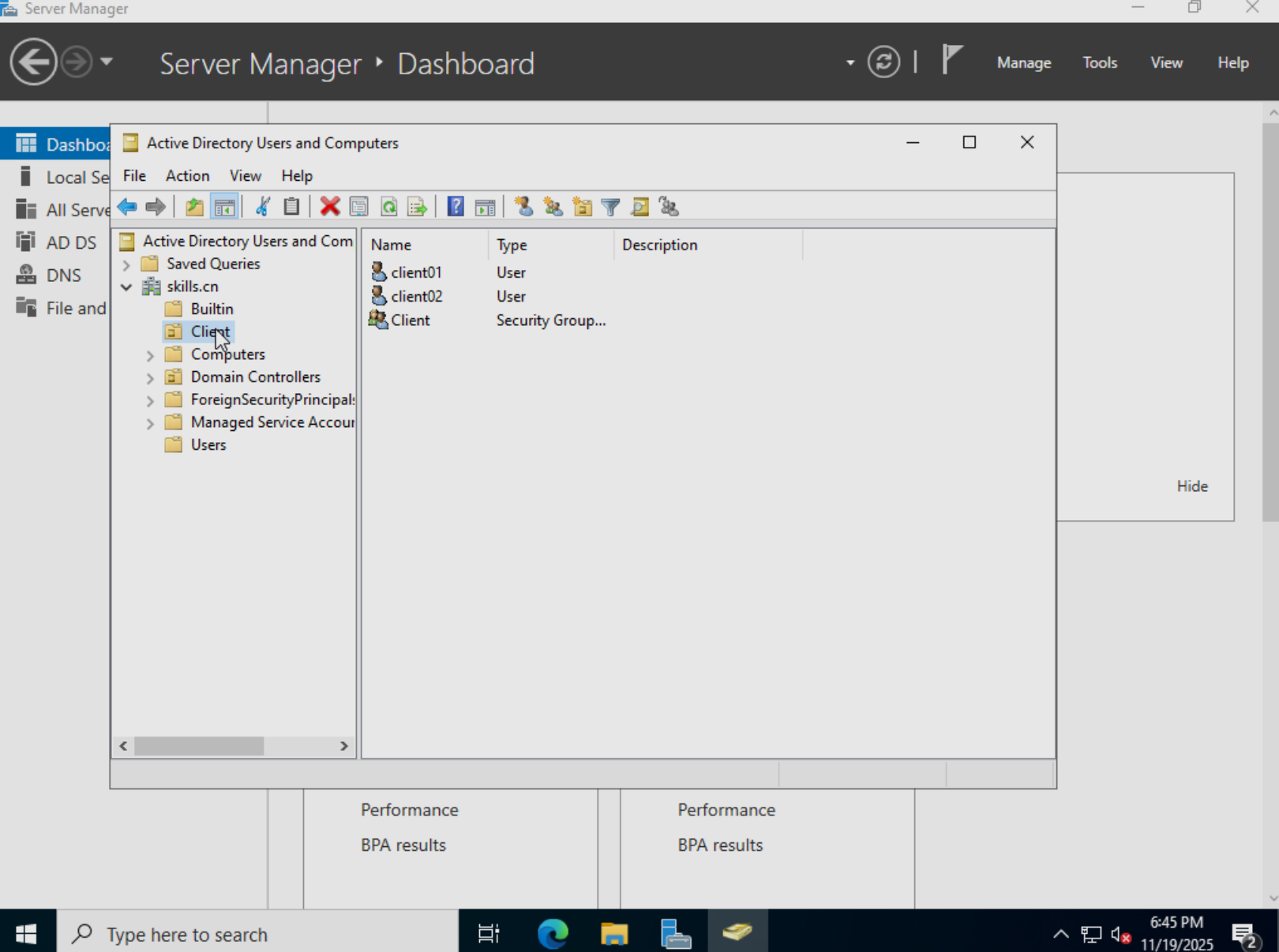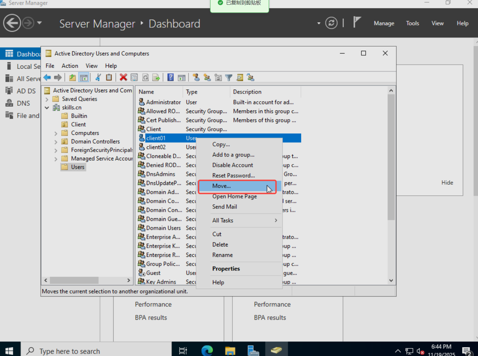 - 选中【Users】下的【Client】组、【client01】【client02】用户→ 右键【移动】→ 选择【skills.cn/Client】→ 确定(将相关对象移动到 Client OU)