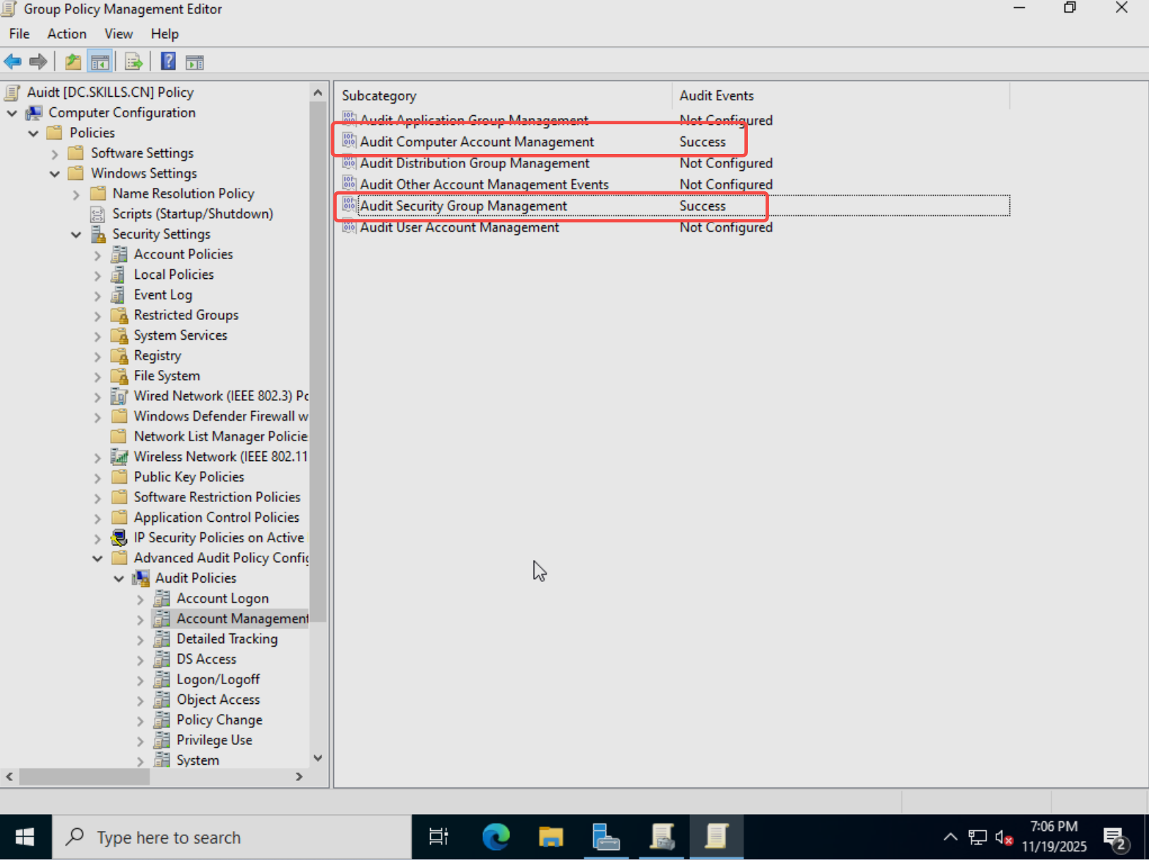 (3)配置 2:配置凭据验证、计算机账户管理、安全组管理的审核(注意此处只对成功做审核