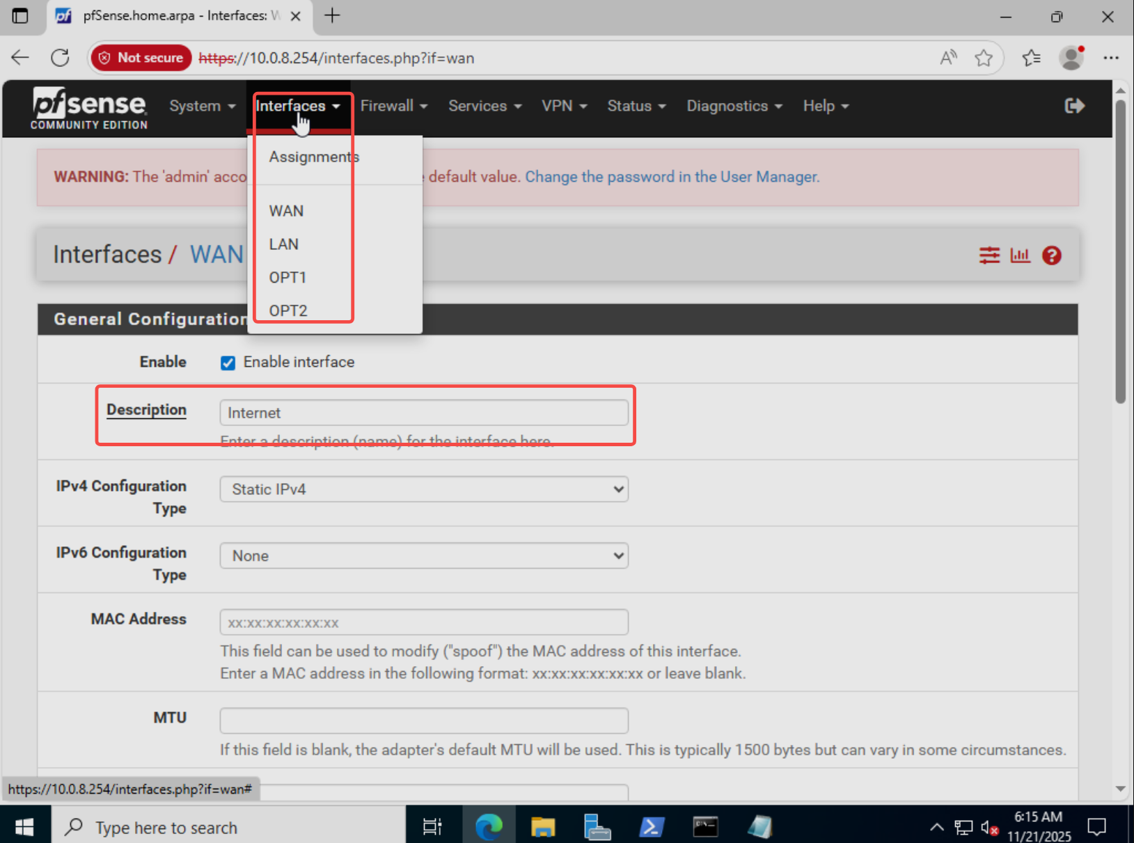 - 进入Interfaces → Assignments,确认接口与物理网卡的绑定关系(FW0=WAN、FW1=LAN、FW2=OPT1、FW3=OPT2);