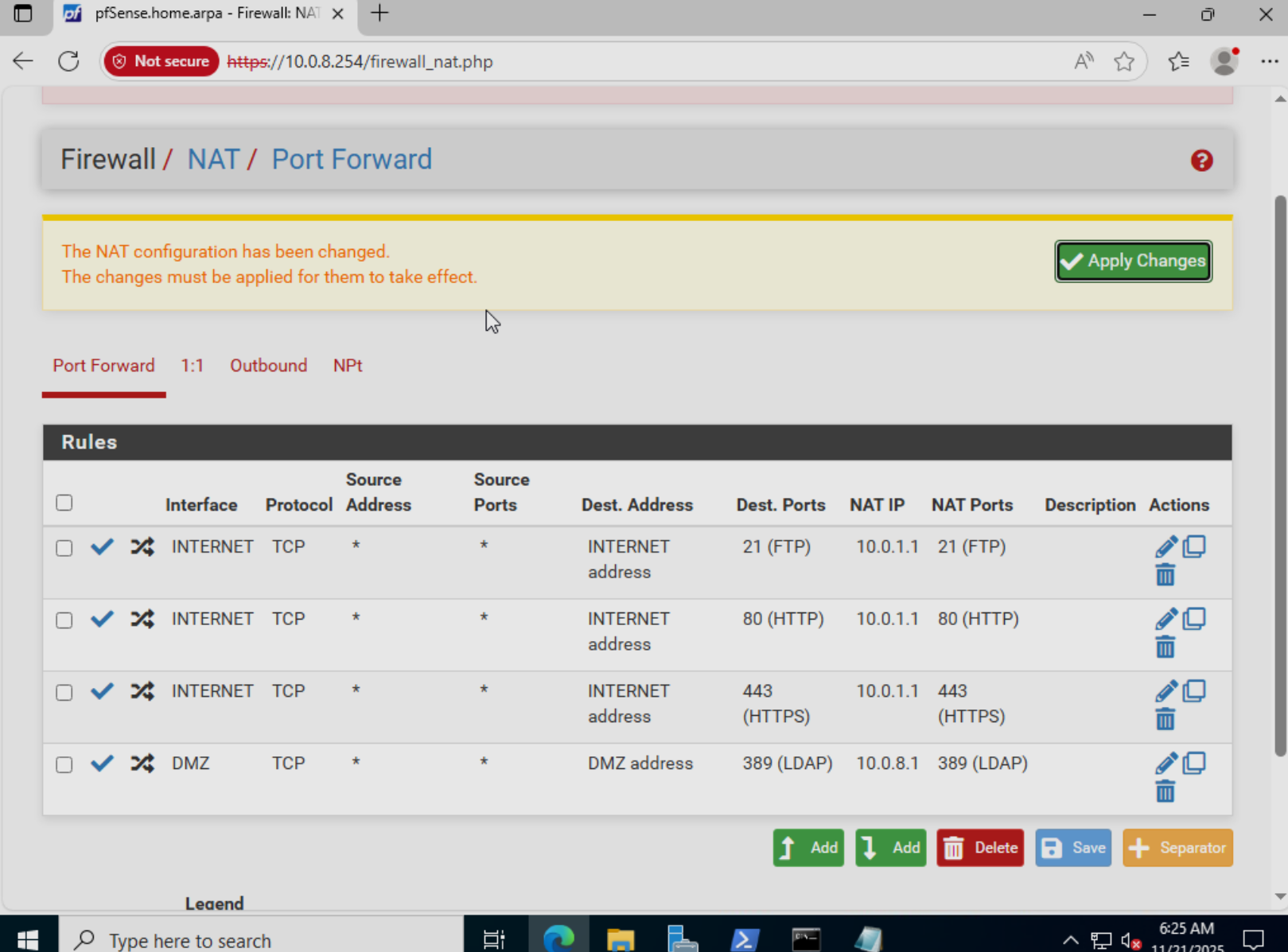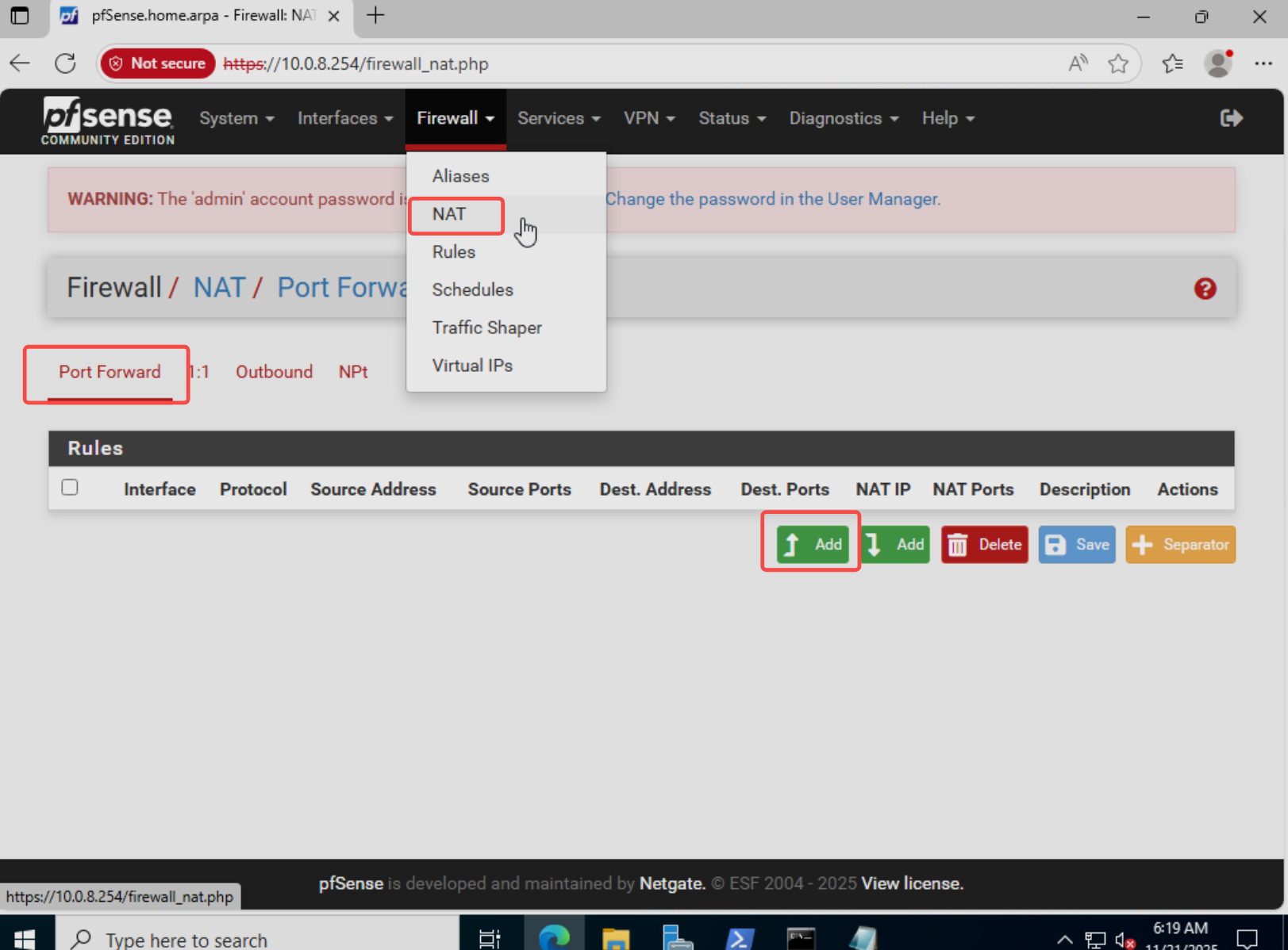 进入 pfSenseFirewall → NAT → Port Forward,点击Add新建转发规则;