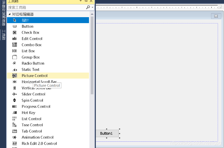 5、打开对话框,删除原按钮,添加button1,添加Picture Control控件,拉至大致16:9比例合适大小,修改控件名称IDC_VIEW:
