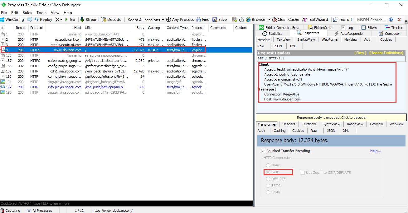 2、如果是在 fiddler 工具乱码,是可以点击后解码的,在代码里面可以用 r.content 这个方法,content 会自动解码 gzip 和 deflate 压缩(这个就是开始介绍requests的高级功能:自动解码和自动解压)