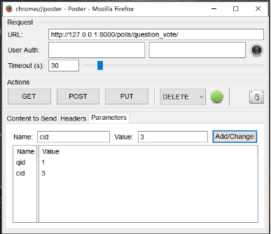 发送POST请求:http://127.0.0.1:8000/polls/question_vote/