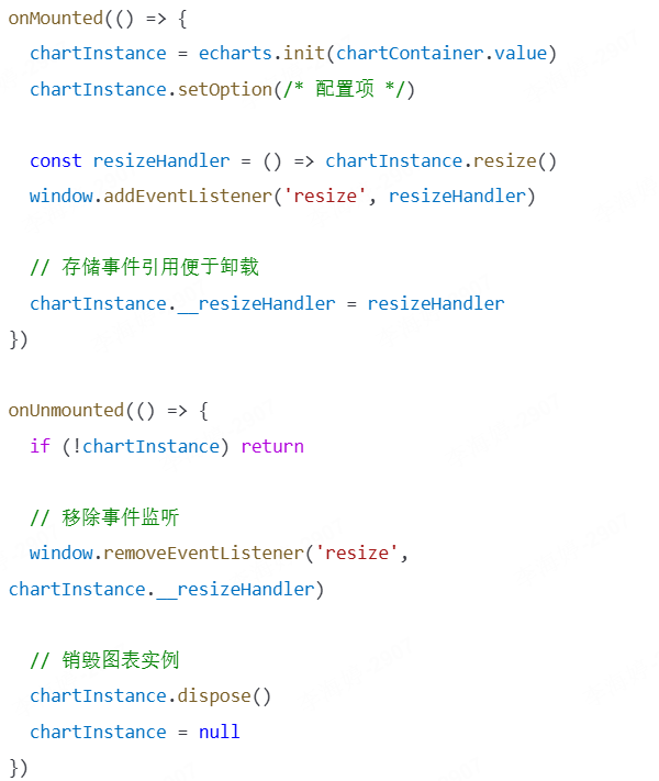 如ECharts、Mapbox等实例未在组件销毁时销毁,持续占用内存。