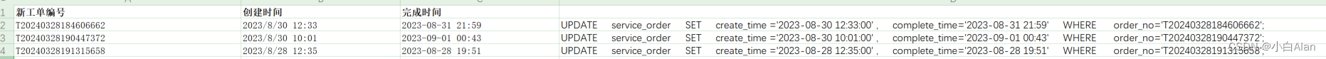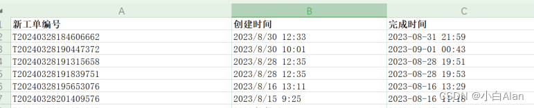 例如这是我们的数据, 要求把创建时间和完成时间刷进数据库中, 工单编号唯一
