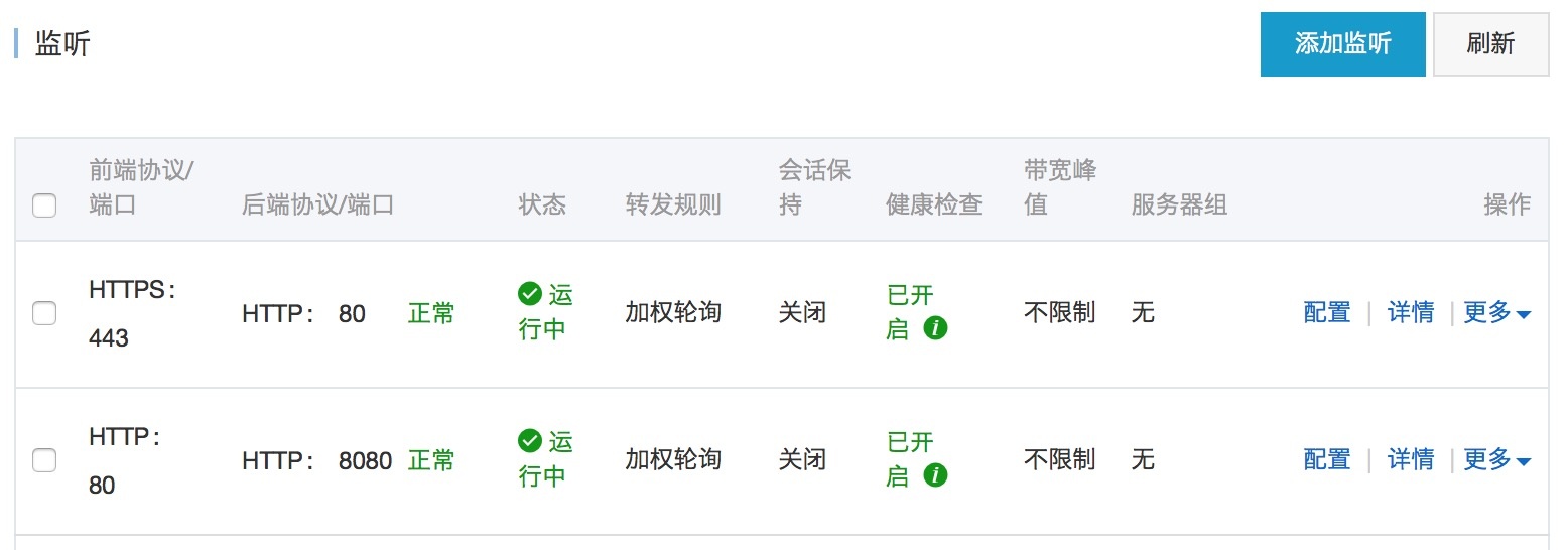 由于网站需要支持 HTTPS ,故 SLB 前端需要监听 HTTPS 的 443 端口,此处,我们将前端 443 端口的请求转发到后端服务器的 80 端口处理,将前端的 80 端口的请求转发到后端服务器的 8080 端口处理。
