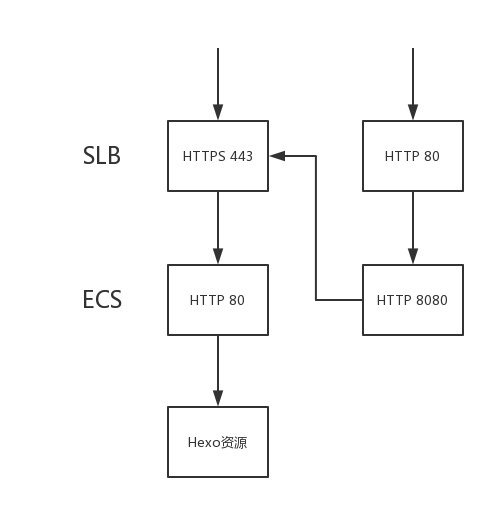 域名 leehao.me 指向负载均衡 SLB(Server Load Balancer)的 IP,在 SLB 后面部署两台后端服务器 ECS(Elastic Compute Service),ECS 上部署 Hexo 的静态资源。