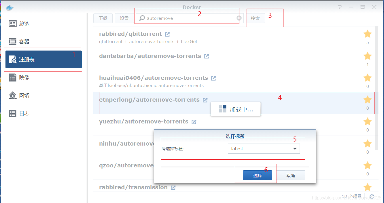 言归正传,下面我们同样通过docker来安装autoremove,首先在注册表中搜索autoremvoe,选择第四项(因为这里我是下载的第四项,并不是说其他的不能用,大家也可以下载其他镜像进行尝试),然后选择最新版本进行下载