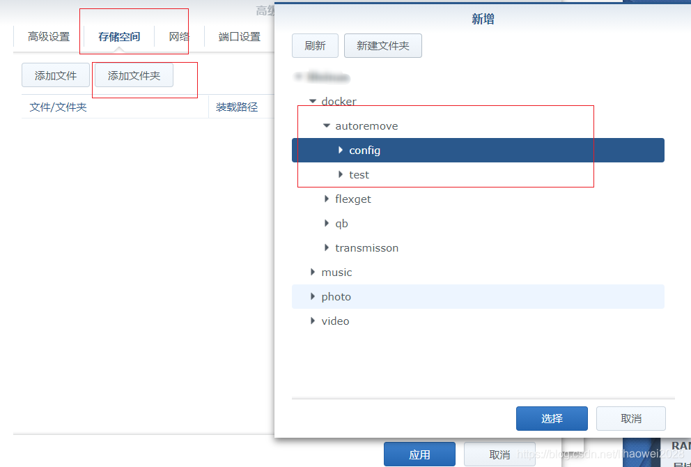 在打开的高级设置中,点击存储空间选项卡,添加文件夹,新建如图文件夹