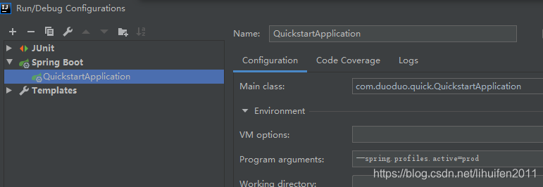 - 在命令行中激活: 打包后,运行java -jar spring-boot-02-config-0.0.1-SNAPSHOT.jar --spring.profiles.active=dev;或在IDEA中的窗口中配置如下:点击Edit Configurations...——》Configuration选项卡下的Program arguments中输入命令: --spring.profiles.active=dev 命令行方式优先级高于在配置文件中激活的方法