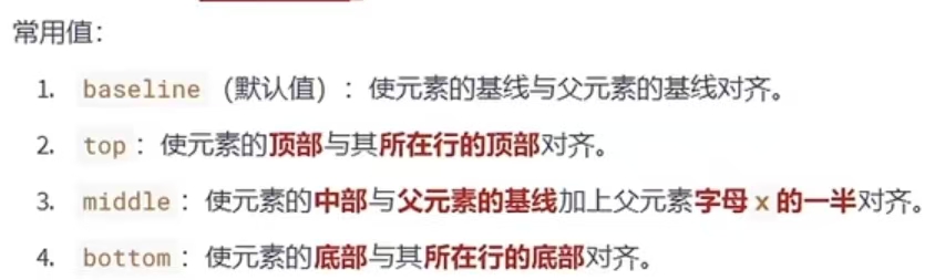 (8)vertical-align:用于指定同一行元素之间,或表格单元格内文字的垂直对齐方式