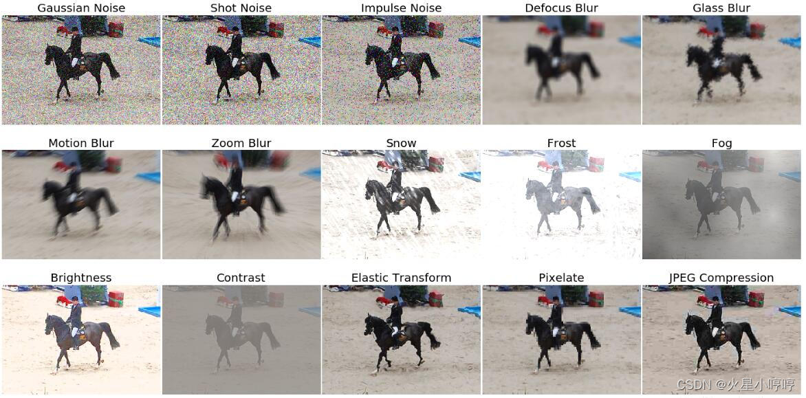 corruption_name为增强的类型:分别为是 ‘gaussian_noise’, ‘shot_noise’, ‘impulse_noise’, ‘defocus_blur’, ‘glass_blur’, ‘motion_blur’, ‘zoom_blur’, ‘snow’, ‘frost’, ‘fog’, ‘brightness’, ‘contrast’, ‘elastic_transform’, ‘pixelate’, ‘jpeg_compression’,‘speckle_noise’, ‘gaussian_blur’, ‘spatter’, ‘saturate’ 共15种类型