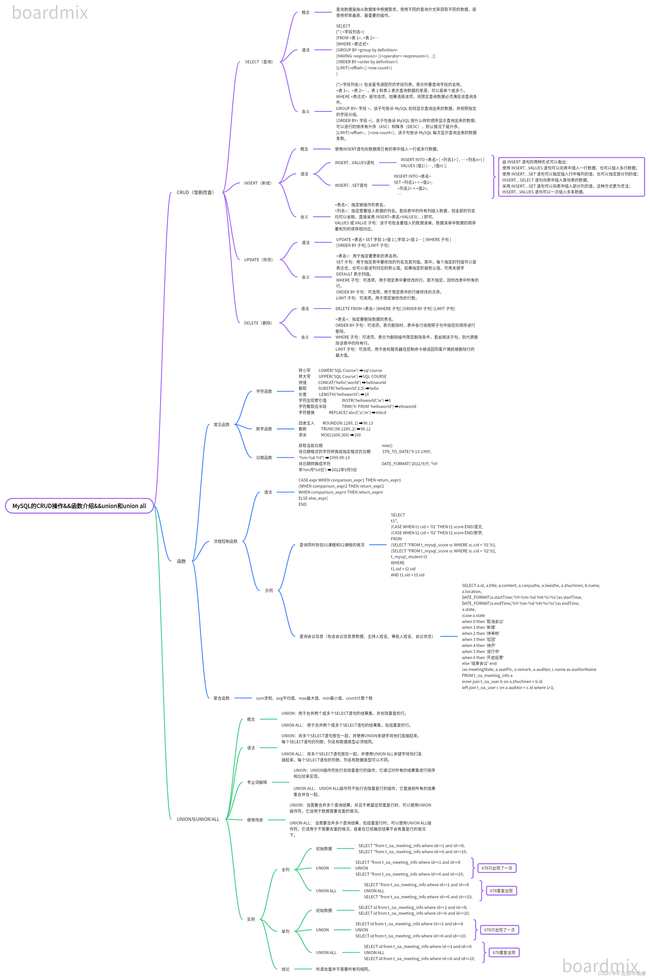 本文详细介绍了SQL中的CRUD操作(增删改查)以及相关的SELECT查询、INSERT新增、UPDATE修改、DELETE删除方法。此外,涵盖了函数(如字符、数字和日期函数)、流程控制函数(如CASEWHEN)和集合操作(UNION与UNIONALL)。通过实例展示了如何在实际应用中使用这些概念。