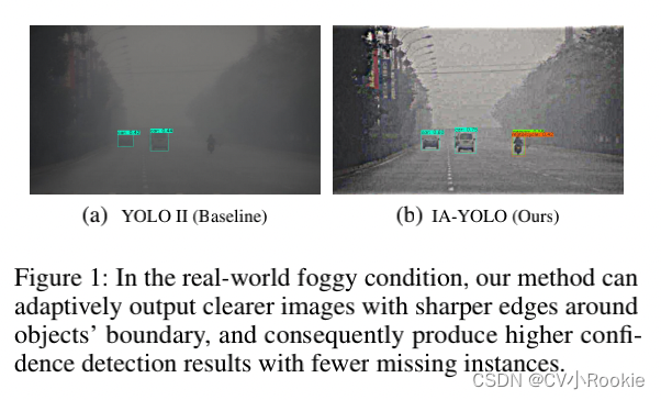 基于 CNN 的方法已在目标检测中盛行(Ren et al. 2015; Redmon and Farhadi 2018)。他们不仅在基准数据集测试中取得了可喜的表现(Deng 等人,2009;Everingham 等人,2010;Lin 等人,2014),也在已部署在实际应用中,例如自动驾驶(Wang et al. 2019)。由于输入图像的域偏移(Sindagi et al. 2020),由高质量图像训练的通用目标检测模型在不利的天气条件下(例如,有雾和暗光)往往无法取得令人满意的结果。Narasimhan 和 Nayar (2002) 和 You 等人(2015)建议在恶劣天气下捕获的图像可以分解为清晰的图像及其对应的天气信息,而恶劣天气下的图像质量下降主要是由天气下信息和对象之间的相互作用引起的,这导致检测性能不佳。图 1 显示了一个在有雾的条件下对象检测示例。以看出,如果图像能够针对天气状况进行适当的增强,更多关于原始模糊对象的潜在信息和识别错误的对象可以恢复。