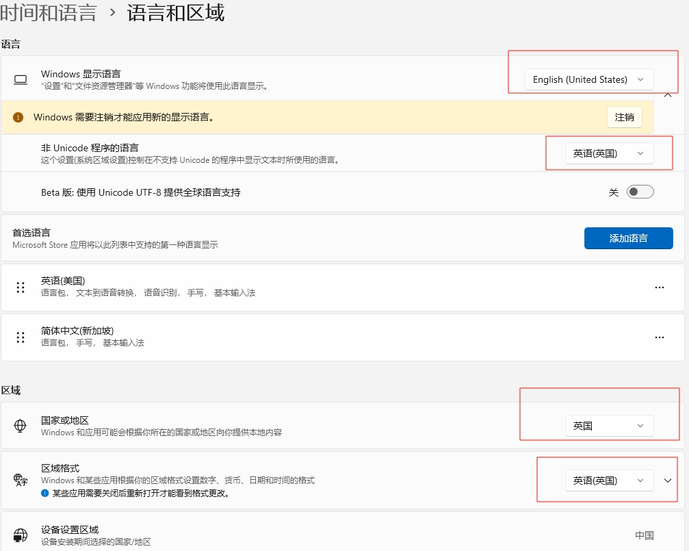 1、首先通过修改控制面板里面的语言设置修改成英文,如图标记的内容,都是英国的,保持一直。然后点击提示的注销按钮,等待系统重新启动。