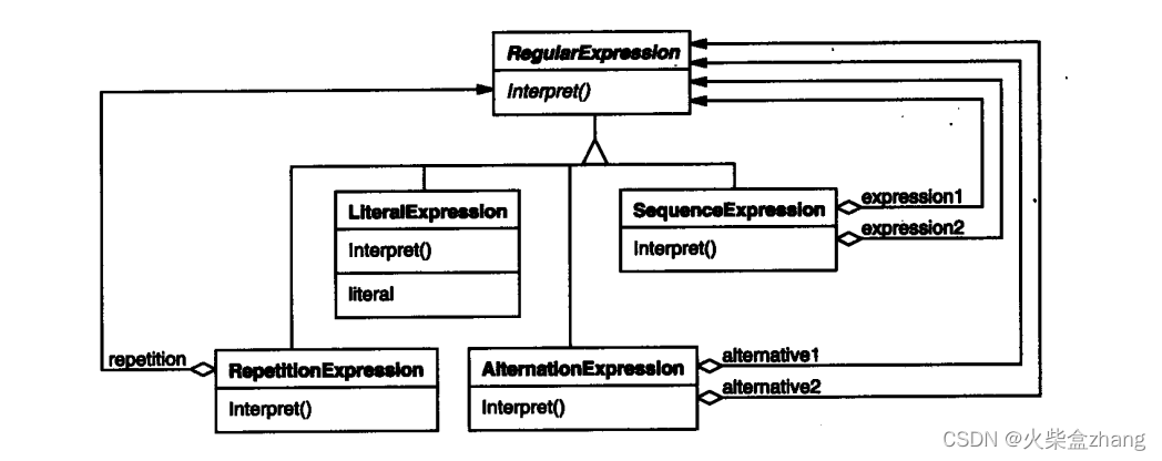 解释器模式使用类来表示每一条文法规则。在规则右边的符号是这些类的实例变量。上面的文法用五个类表示:一个抽象类RegularExpression和它四个子类LiteralExpression(文字)、AlternationExpression(选择or)、SequenceExpression(sequ 跟随)和RepetitionExpression(重复)后三个类定义的变量代表子表达式。