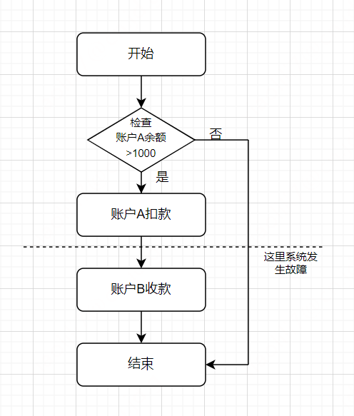 每个系统都不是十全十美的,我们无法预料系统什么何时回发生故障,但我们能做的就是在事故发生时,我们的系统拥有能应对事故的能力,这次消失的1000元是由于未保障原子性导致的。没有保障的系统会引发用户的信任危机,最终使得系统被抛弃,甚至使得业务走向失败。转账这个功能是一个完整的业务,这个业务下的所有操作应该保持一致的执行结果要么一同成功,要么一同失败。