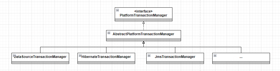 Spring并不直接管理事务,而是提供了统一的PlatformTransactionManager接口,下图是展示了PlatformTransactionManager部分子类,各个ORM平台通过实现该接口提供具体的事务管理机制,如jdbc与iBatis提供的该接口实现类为DataSourceTransactionManager。