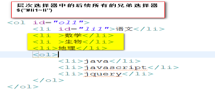 4)选择后续所有的兄弟:$("选择器1~选择器2")
