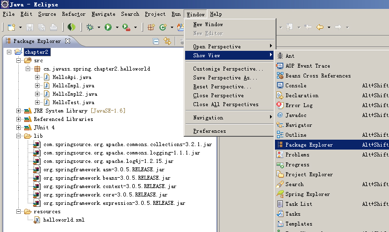 (1)选择“window”—> “Show View” —>“Package Explorer”,使用包结构视图;