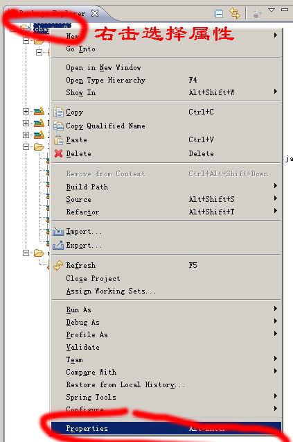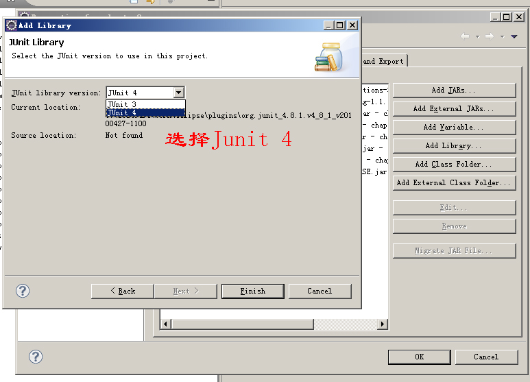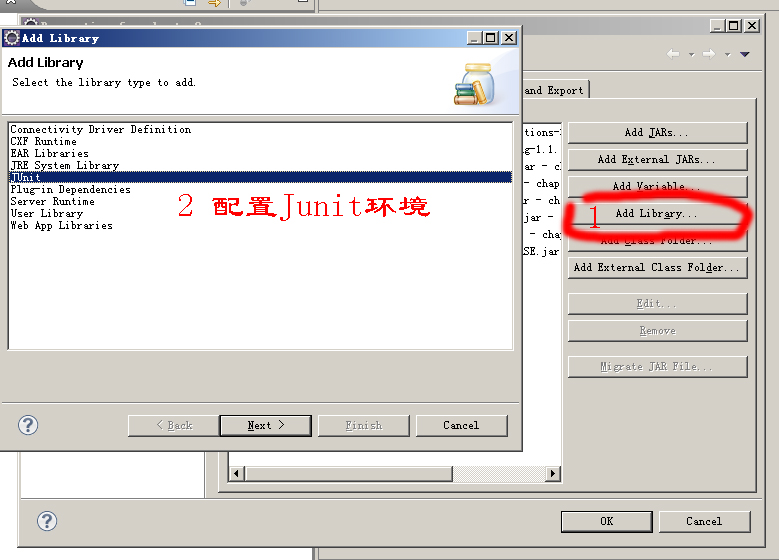 (3)配置项目依赖库文件,右击项目选择“Properties”;然后在弹出的对话框中点击“Add JARS”在弹出的对话框中选择“lib”目录下的jar包;然后再点击“Add Library”,然后在弹出的对话框中选择“Junit”,选择“Junit4”;