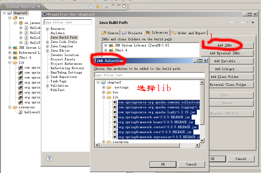 依赖的jar包:从下载的spring-framework-3.0.5.RELEASE-dependencies.zip中查找如下依赖jar包