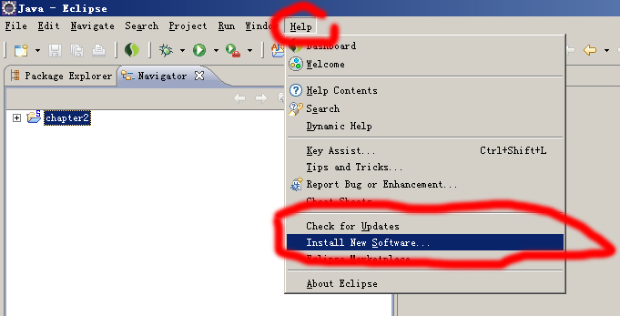 安装插件:启动Eclipse,选择Help->Install New Software,如图2-3所示