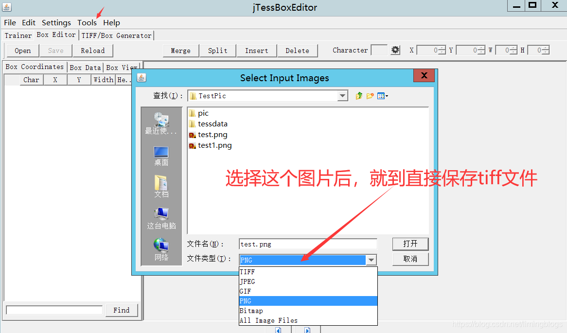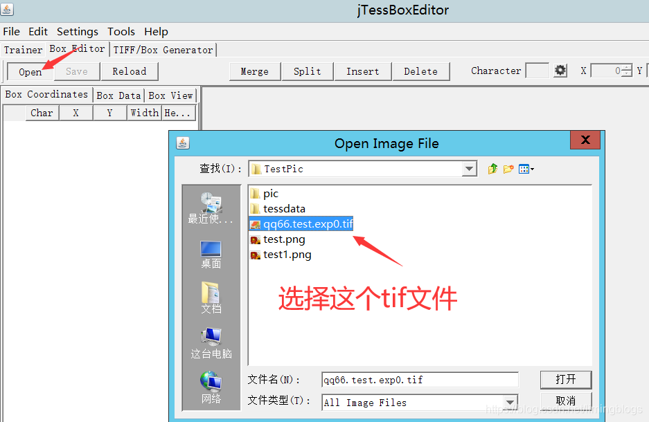 (1)打开jTessBoxEditor,选择Tools->Merge TIFF,进入训练样本所在文件夹,选中要参与训练的样本图片:
