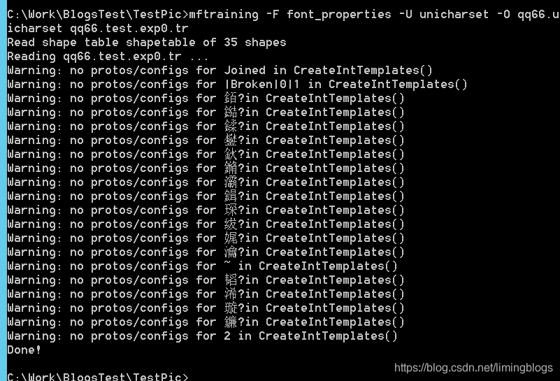 mftraining -F font_properties -U unicharset -O qq66.unicharset qq66.test.exp0.tr