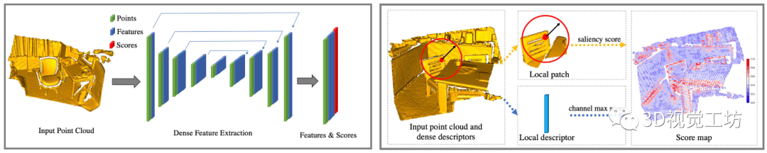 本工作受D2-Net启发,提出了一种新的三维点云关键点定义方式,将其与三维点的特征描述子关联起来,有效的回答了什么是三维点云中的关键点,并验证了该方法检测到的关键点的可重复性。但是,本方法的不足也十分明显。正是由于它将关键点的检测定义在三维点云点特征上,因此,在检测关键点时,需要对输入点云的所有点都提取相应的点特征。这样的话,即使此方法检测到的关键点可以有效用于后续任务,但此方法本身仍需处理完整点云中的所有点,并不能在关键点提取阶段就有效的降低计算和内存压力。