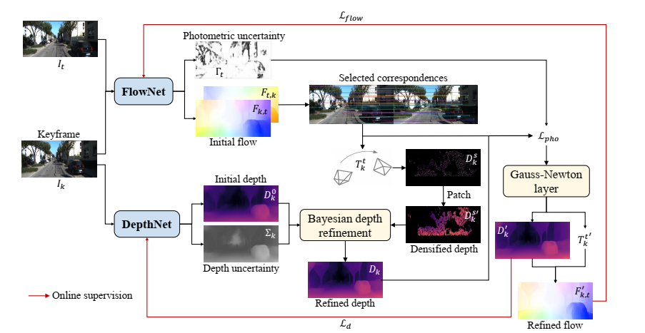 首先,FlowNet网络估计关键帧和当前帧之间的稠密光流,同时估计光流不确定度映射。另外,使用DepthNet网络估计关键帧的深度均值和不确定度(为当前场景几何提供先验)。通过本质矩阵或PNP从被选择的匹配图像中求解位姿。在线自适应阶段,首先通过可微三角化算法重建了的稀疏深度。然后先验关键帧深度通过贝叶斯更新网络的深度估计得到进一步的提高。接着,差分高斯牛顿层最小化了和的光度损失。最后,优化后的深度和光流作为伪真值来监督DepthNet和FlowNet的在线学习。
