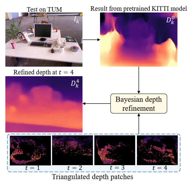 在自适应过程中,DeepNet在线学习新的场景几何的先验知识。此外,学习到的不确定性还可以用来衡量概率深度融合的可靠性。